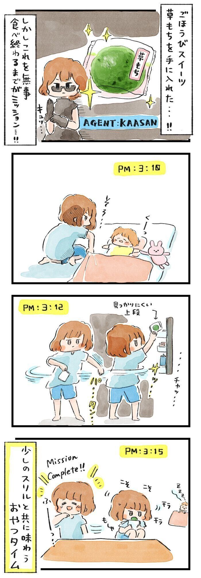 完全に寝たと思っても、実はその眠りはダミーだったということも起こりうるので、ごほうびスイーツも証拠隠滅するようにコソコソと食べていました。