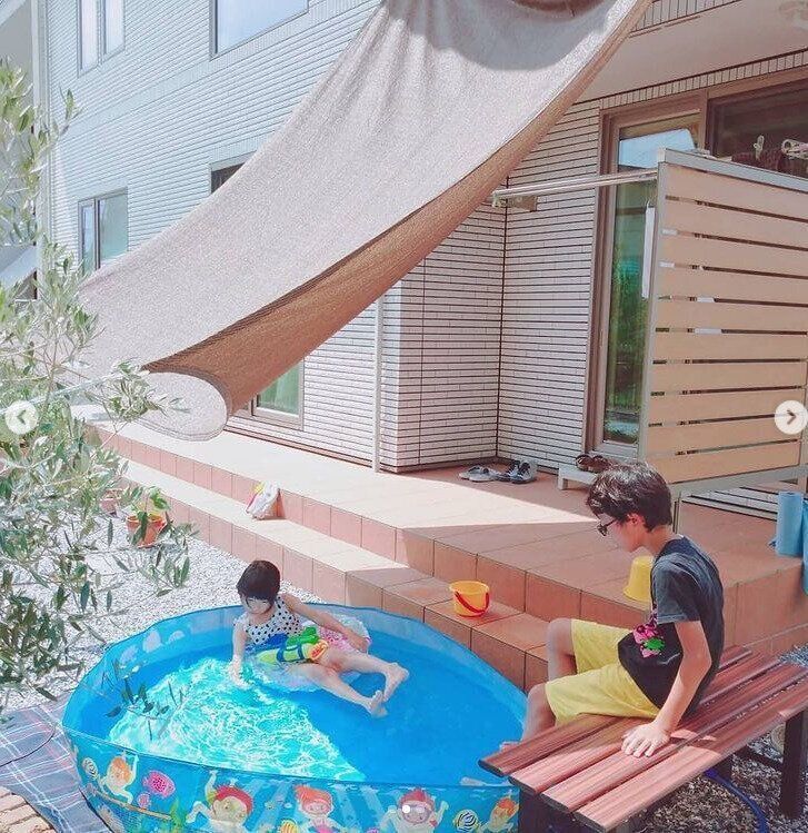 こちらは、Tonkoさんが設置したブラウンのシェードです。絶好のプール日和のお写真だとか♪ お庭で遊ぶ子ども達を、強い日差しから守ることができます。見守るママやパパも安心できますね。落ち着いたブラウンカラーが、お家の外装とマッチしてとってもオシャレです!