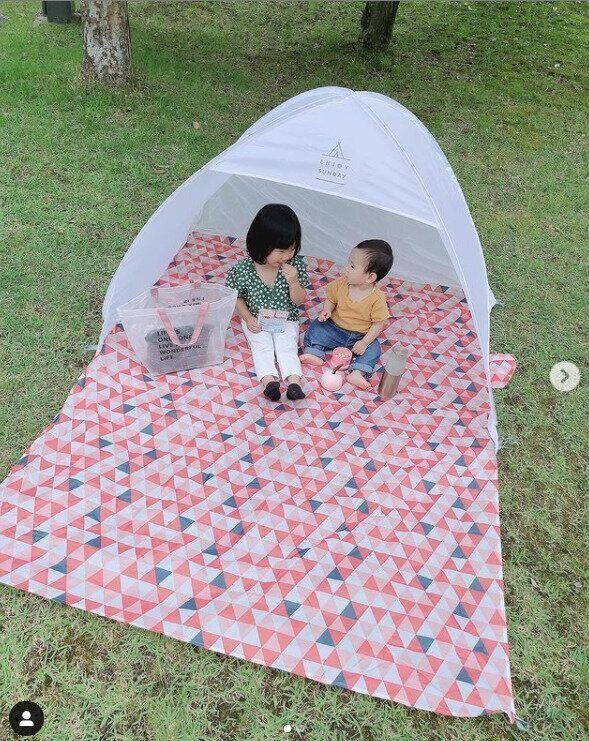 こちらは、Ryoさんが購入したポップアップテントです。3COINSにて1,650円で購入したそう。テント専用の袋があってコンパクトに収納できるんだとか。そして小さすぎず大きすぎず、公園にも持っていきやすいサイズだそうです♪ 子ども達の休憩場所にピッタリですね!