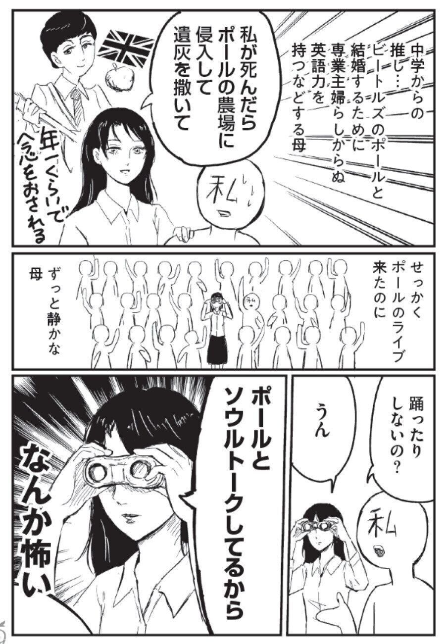 並庭 両親の結婚話は2巻に描いていますが、父は相手(ポール)が外国人の世界的スターだということで、ちょっと遠い世界の話だと気にしていないようです(笑) 父と出会う前から母はポールファンですし、スゴすぎる人ですし。
