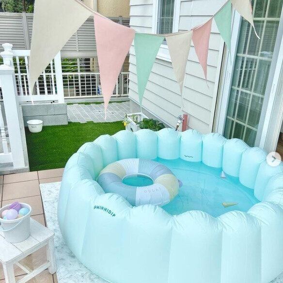 yuyuyuさんが購入したのは、ベランダで使うビニールプールです。お気に入りのものが見つかるまで、オンラインショップを探し回ったんだどか!大人も入れる大きさだそう♪ とってもキレイなパステルグリーンで、お家の白い壁に映えますね!