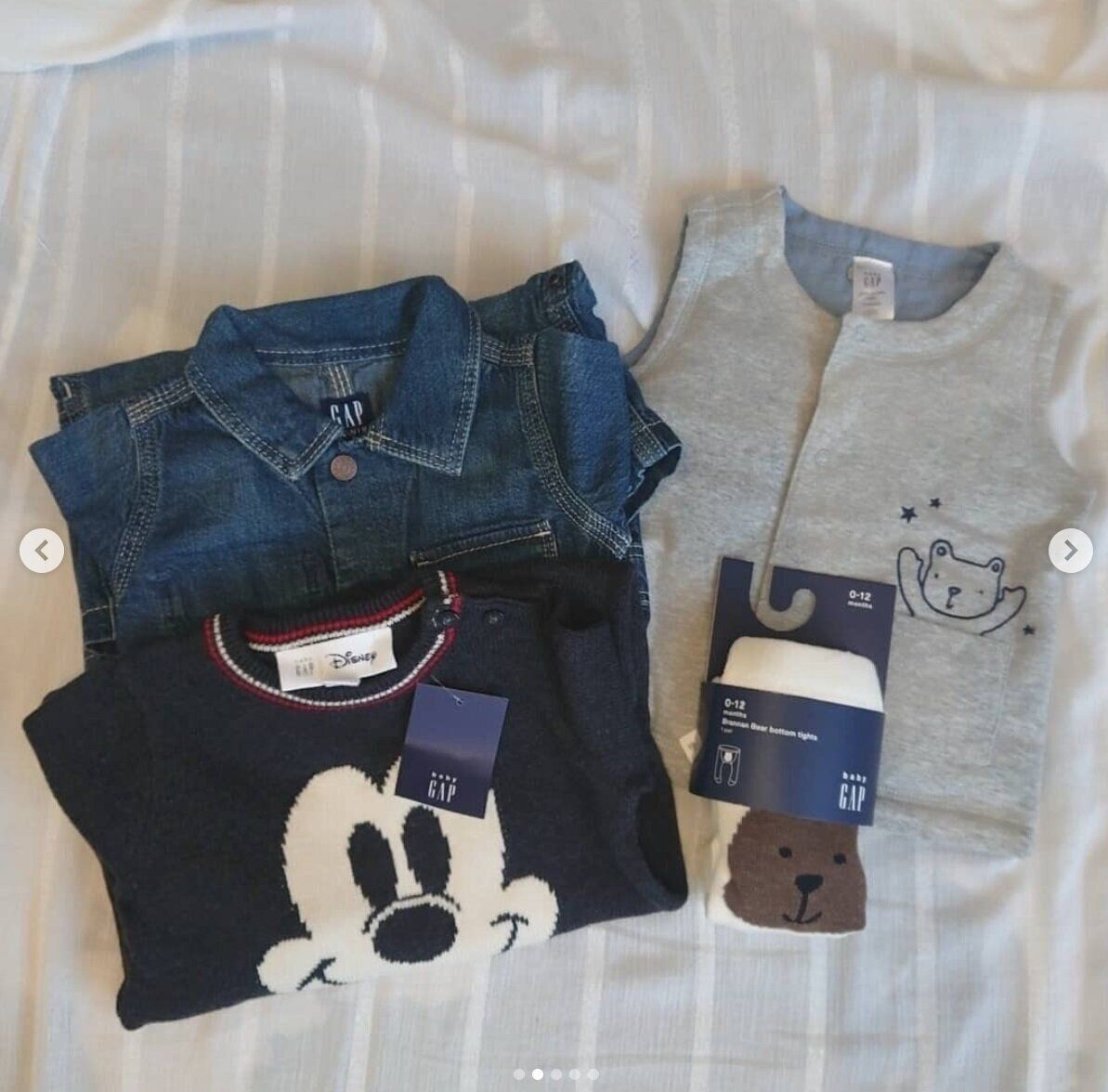 こちらはまりさんの購入品です。セール価格の990円でGETできたというベストはリバーシブルだそうで、大きめサイズを買ったとのこと!ミッキーやデニムシャツ風のロンパースも990円で購入できたんだとか。