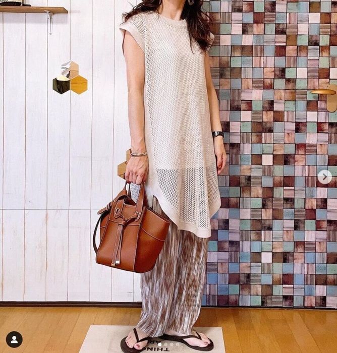 ゆりさんはこちらのリラックス感ただようコーデを。しまむらのメッシュトップスとサンダルは、夏らしい爽やかな組み合わせですね。インシードのニュアンス柄プリーツパンツも軽やかで素敵!着心地も良さそうですね。