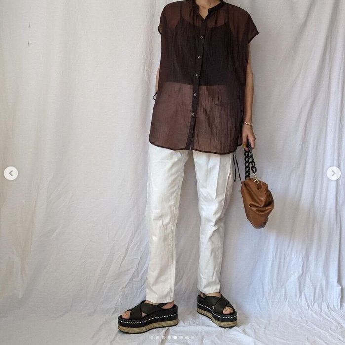 KaoriさんはGUのシアーシャツをポイントに、白デニムと合わせた装いを。深みのあるブラウンカラーは透けていることで軽やかな印象に。大人っぽいシンプルコーデにピッタリ!と即買いしたんだとか。大人かっこいい雰囲気ですね!