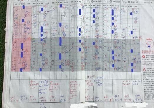 上の写真は中原さんが記した双子の育児日誌。丸で囲んである“ボ”は“母乳”で、赤で30、青で80など1人ずつ色を分けて飲ませた量をメモしていました。うんちやおしっこの回数や様子も、細かく記録してあります。