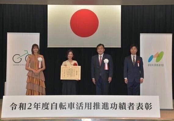 2020年7月、自転車活用推進功績者として国土交通省より表彰を受けた中原さん。右はOGK技研㈱の木村社長。
