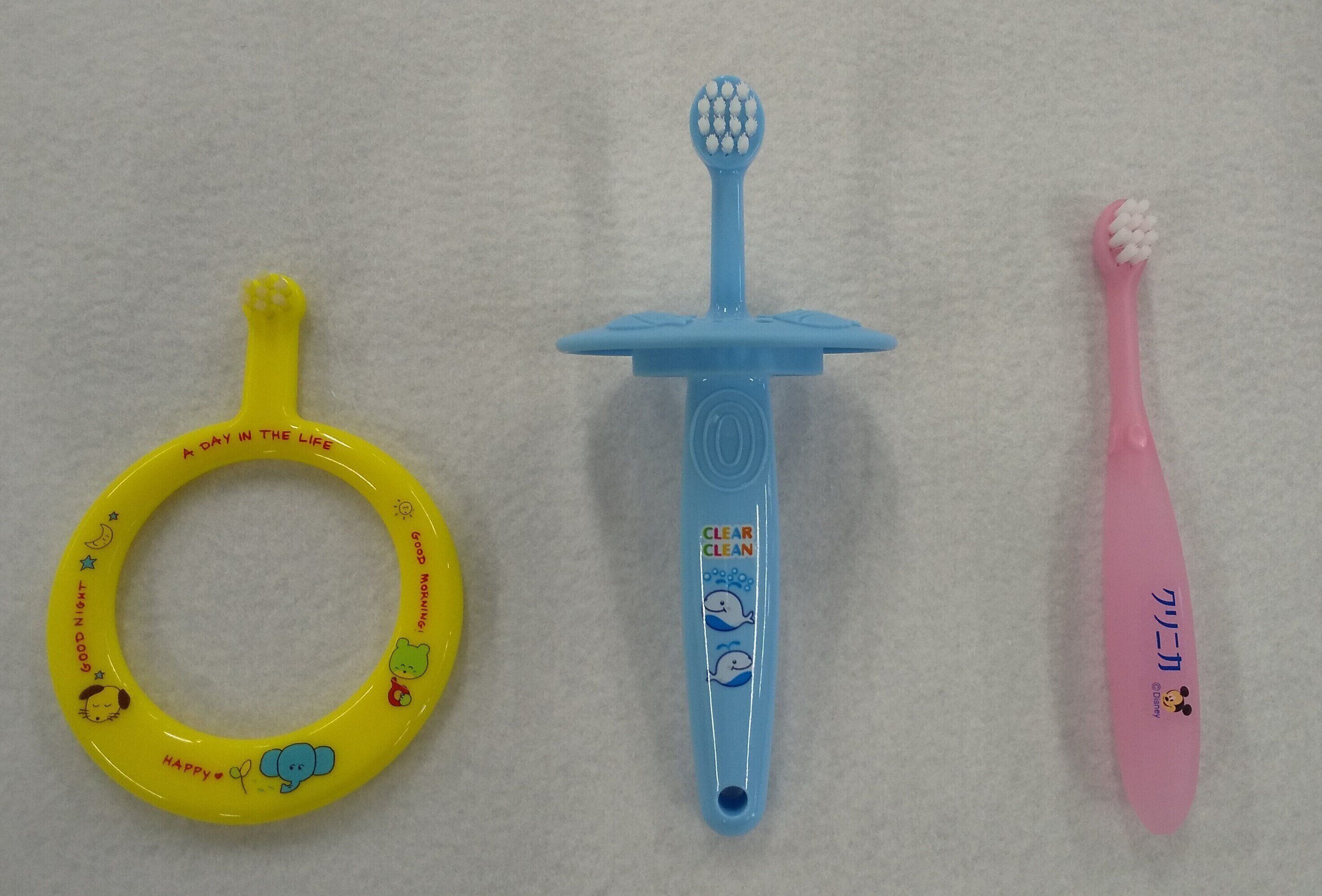 写真のようなのど突き防止の歯ブラシを使いましょう。のど突き防止の歯ブラシは、安全パーツを確認して正しく使うことが大切です。