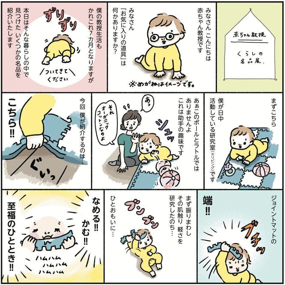 男の子の赤ちゃんであり、日々さまざまなことを発見する、研究熱心な教授でもある。好きなものは、絵本と、ジョイントマットの端。