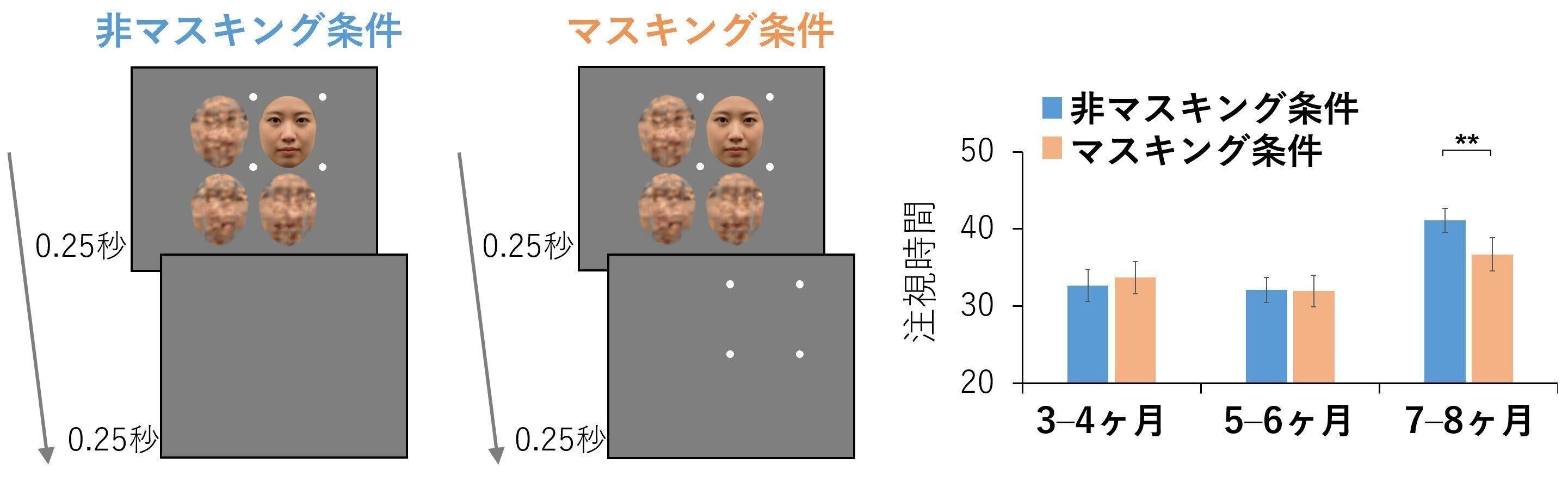 実験のやり方は、3カ月から8カ月の赤ちゃんを対象に、0.25秒だけモニター画面に顔をうつします。その際、顔と一緒に4つの点を提示します。そして顔が消えると、左の『非マスキング条件』には点がなく、右の『マスキング条件』には4つの点が残ります。