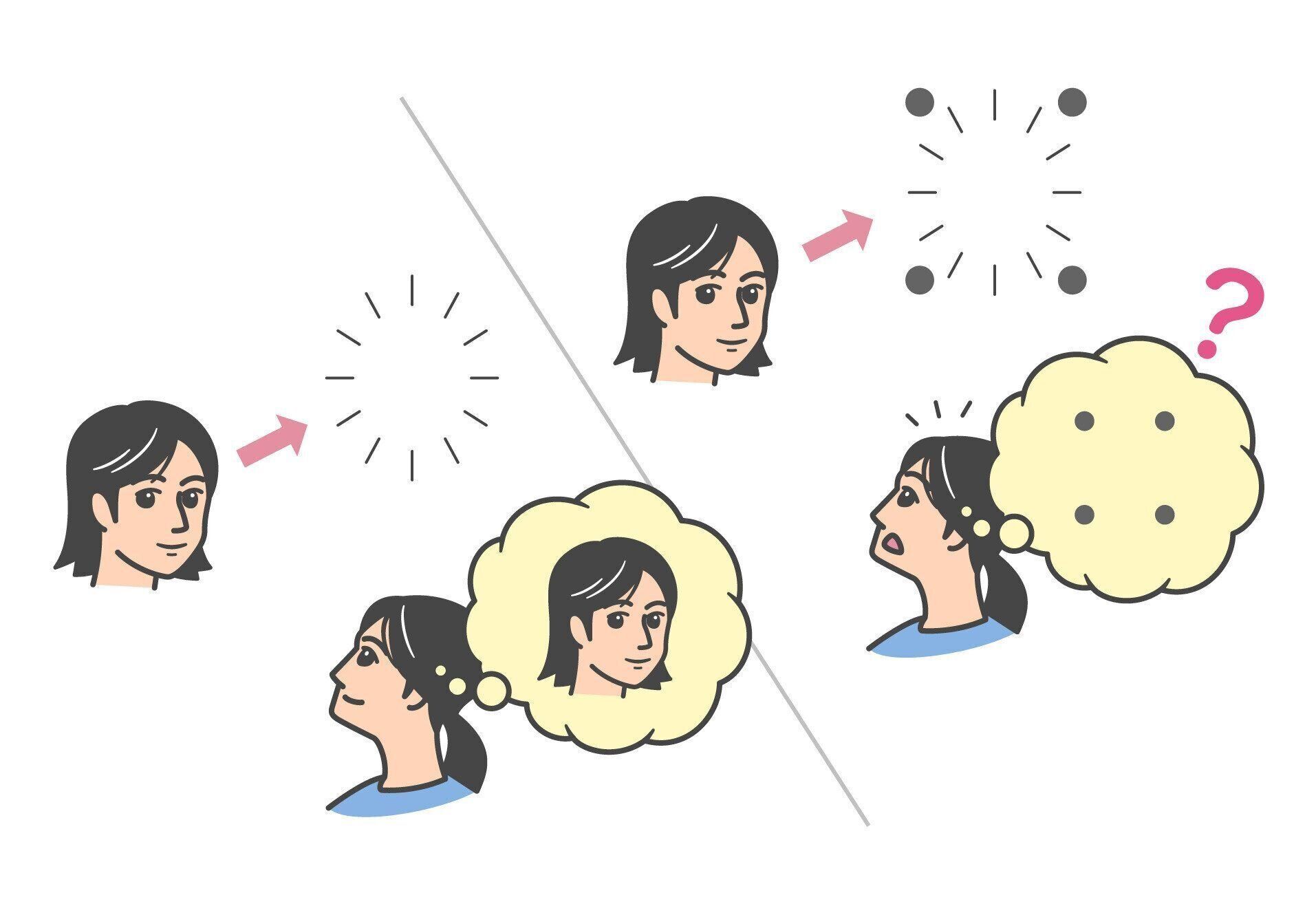 上のイラストは、逆向マスキングの例。人の顔がほんの一瞬現れると、おおまかに人の顔が認識できます(イラスト左)。しかし直後に、ほかの物体が現れると、最初の人の顔が認識できなくなります(イラスト右)。