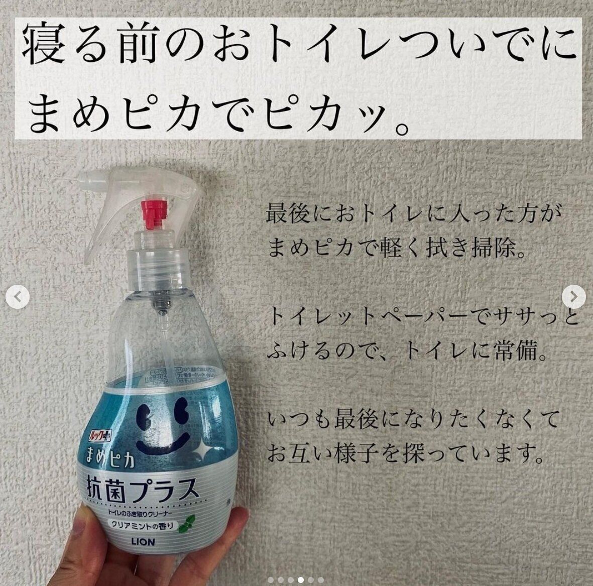 西野家日記さんのお宅では1日の最後にトイレに入った方が拭き掃除をするそうで、まめピカを使うとトイレットペーパーでササッと拭きやすいとのこと。負担の少ないこそうじ(小掃除)なら分担しやすいですよね。