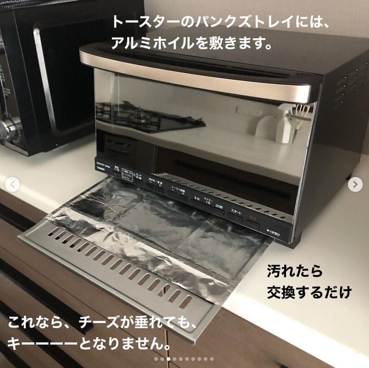 楽してキレイを保ちたいというricoさんが実践しているこそうじ(小掃除)がこちら。トースターのパンくずトレイにアルミホイルを敷き、汚れたら交換するようにしているそう。こびり付きがちな汚れを防止できそうですよね!