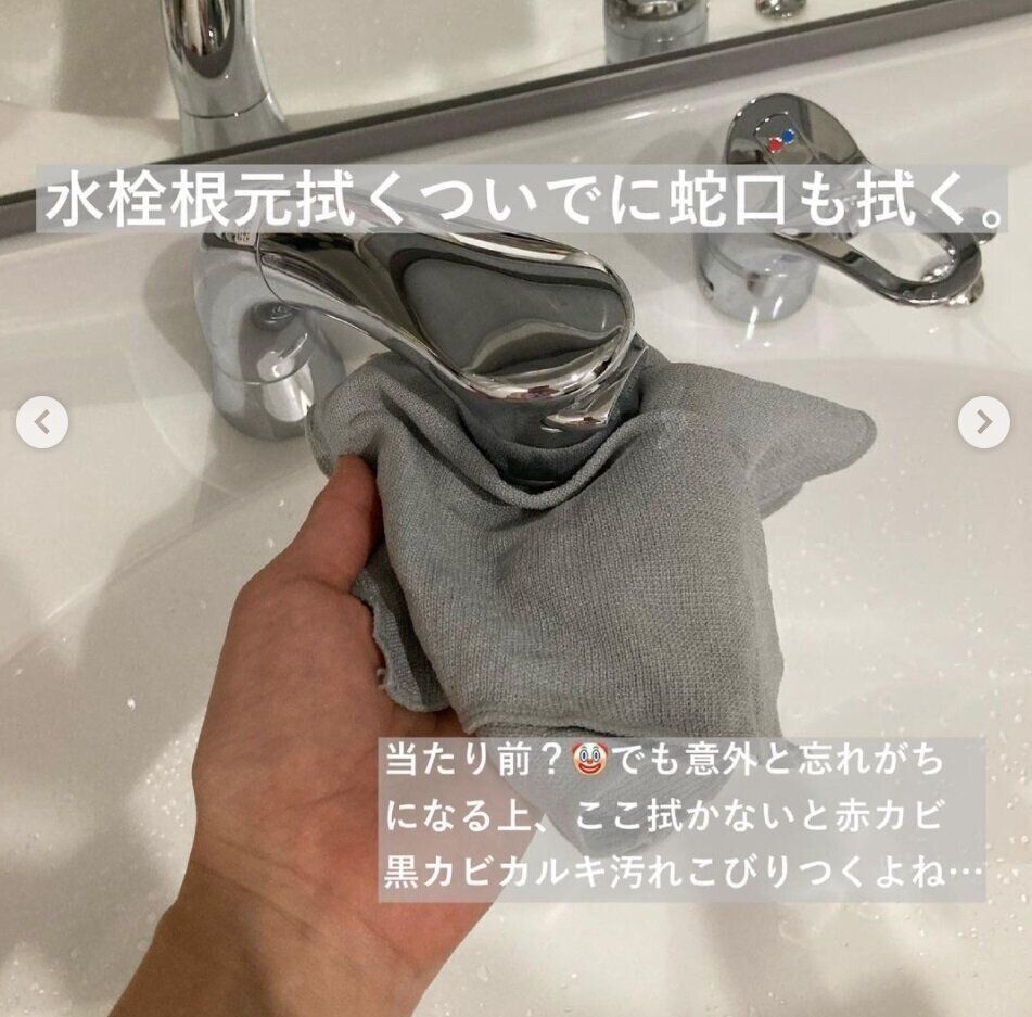 とりからさんは洗面台を拭くついでに蛇口も拭き上げるようにしているそう。掃除を忘れがちだという蛇口は赤カビや黒カビ、カルキ汚れがこびり付きやすい場所とのこと。ついでこそうじ(小掃除)なら取り組みやすいですよね。