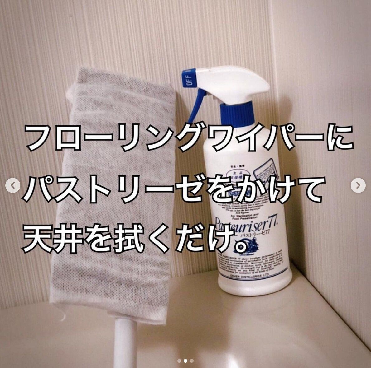 mamanさんはフローリングワイパーでお風呂の天井をこそうじ(小掃除)。パストリーゼを吹きかけて拭くことでカビ予防になるんだそうです。見落としがちな天井もしっかりキレイにしておきたいですよね!