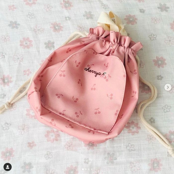 こちらが、今しまむらで話題の巾着おむつポーチです。中には仕切りがあり、おむつとおしり拭きを入れるスペースに分かれているようです。柄も数種類あって、みぃちゃんママさんは、大好きなさくらんぼ柄が出ていたので買ってみたそうですよ。