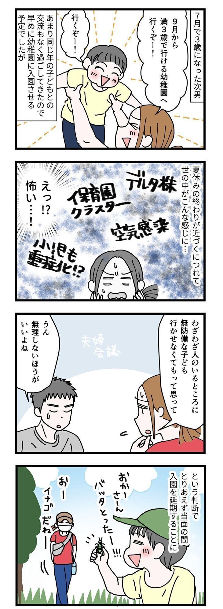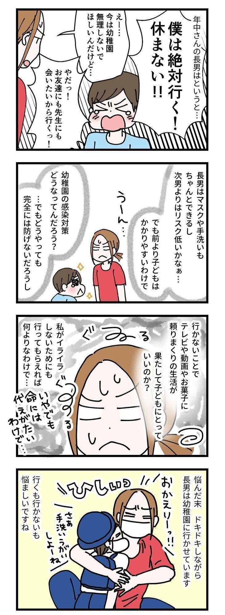 「幼稚園の他の人はどういう対応なのかな?」「いや、他の人がどうってより、自分達がどうしたいかじゃないか!?」「違う園とはいえ、次男を行かせないで長男を行かせるってどうなの!?」