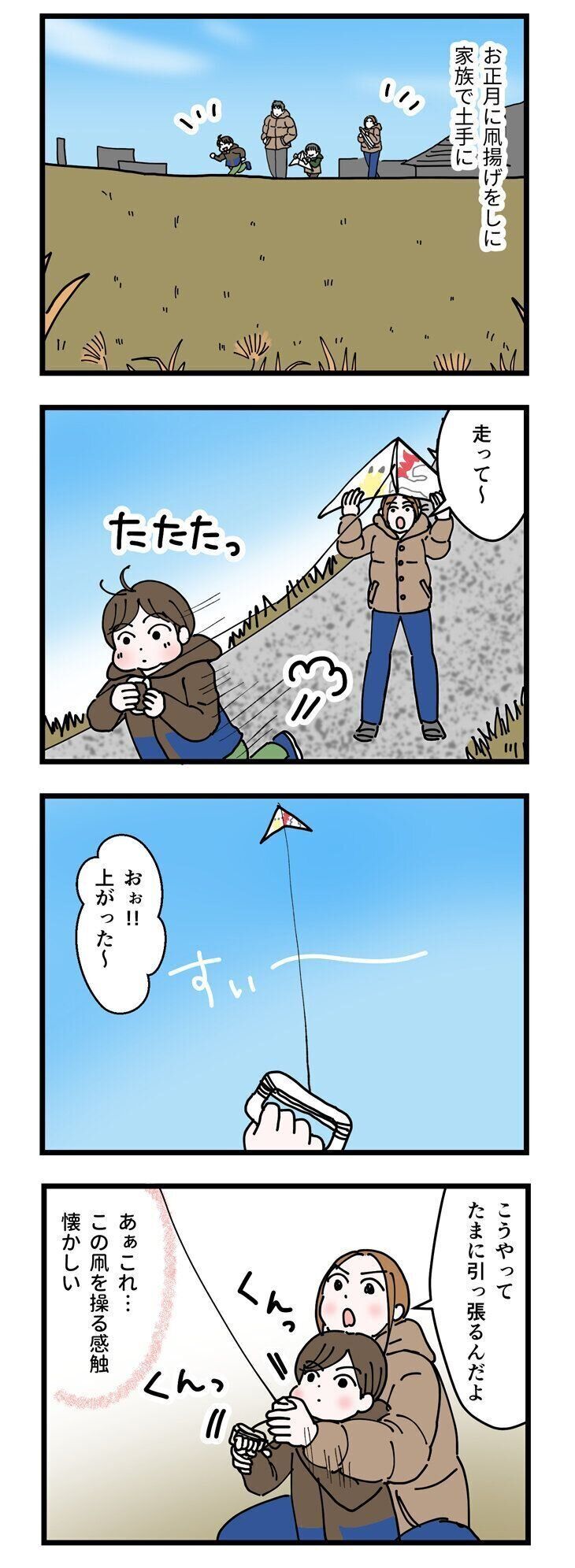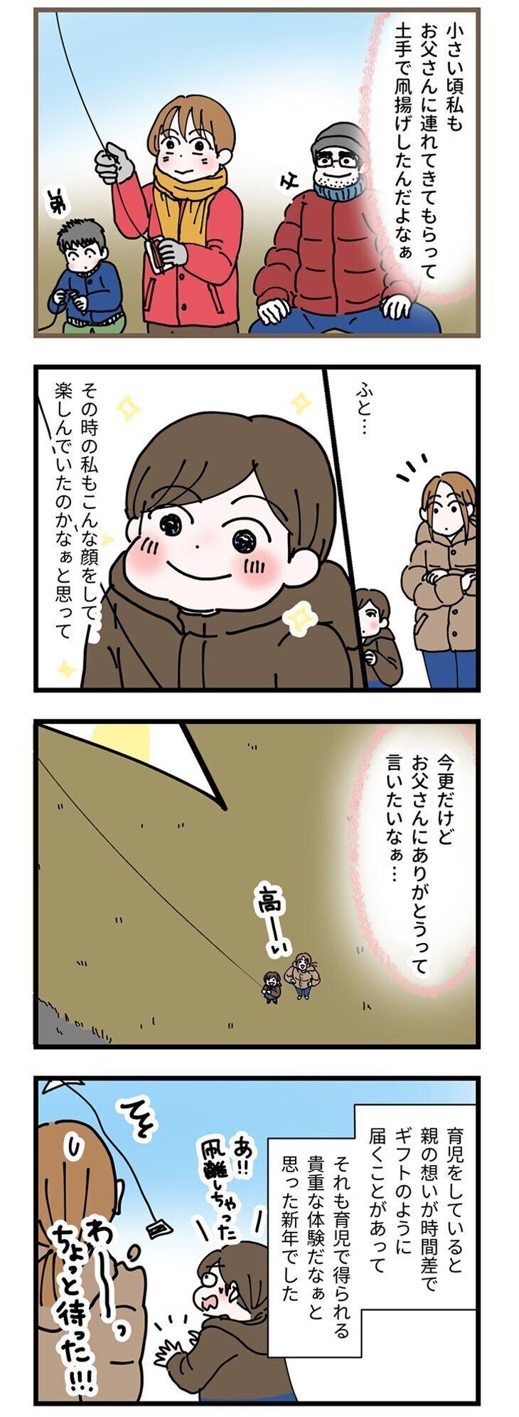 さて、初めて子どもと凧揚げに行ったお正月。風の強い川岸で凧がぐんぐんと空にあがり、その光景や手触りが懐かしい記憶を運んできてくれて、なんとも言えない気持ちが色々とこみ上げてきました。幼い頃、よく父が土手に連れて行ってくれて、凧揚げの仕方を教えてくれたこと、草すべりをたくさんしたこと。遊びに積極的に連れ出してくれた父だったなぁと思い、その体験が今こうして私から息子に繋がっていることに感謝の気持ちが湧き上がりました。その晩は普段はなかなか言えないけれど、父に感謝のラインを送ったのでした。
