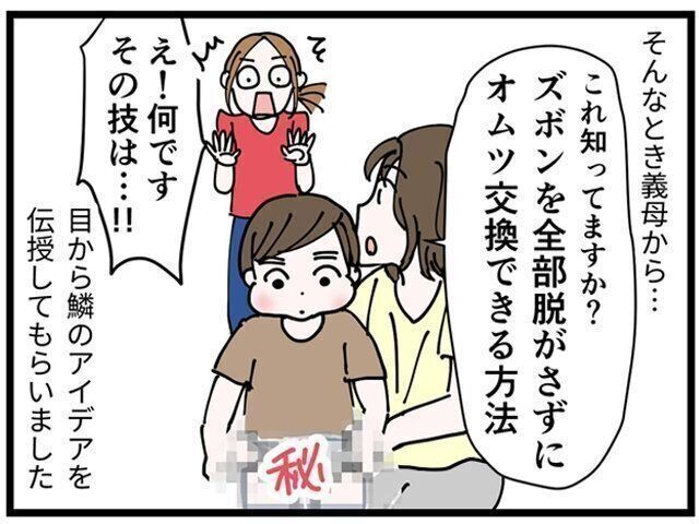 1日に何度もしなきゃならないオムツ交換。ある日、介護の心得のある義母が、大人のオムツ交換でやっていた方法を教えてくれたのですが、それが考えもつかなかった新しい方法で…。何ともビックリな時短テクニックでした!