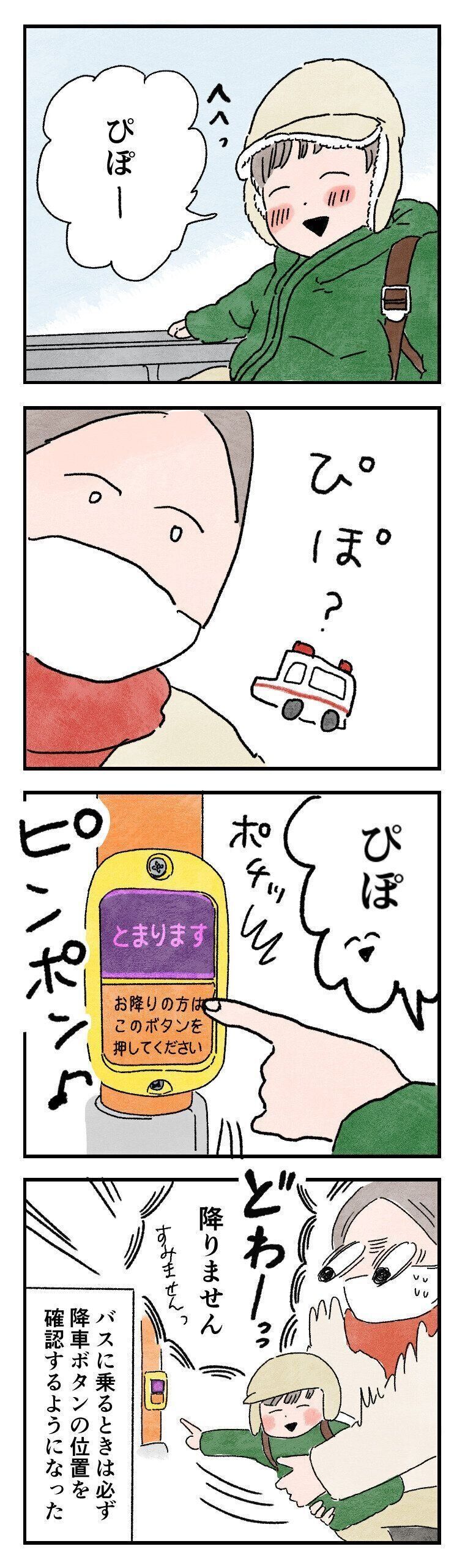 それまで降車ボタンを押したがることはなかったので完全に油断していました…。周りの人が押すところをじっと見ていて、自分もやりたいと思っていたのかな。