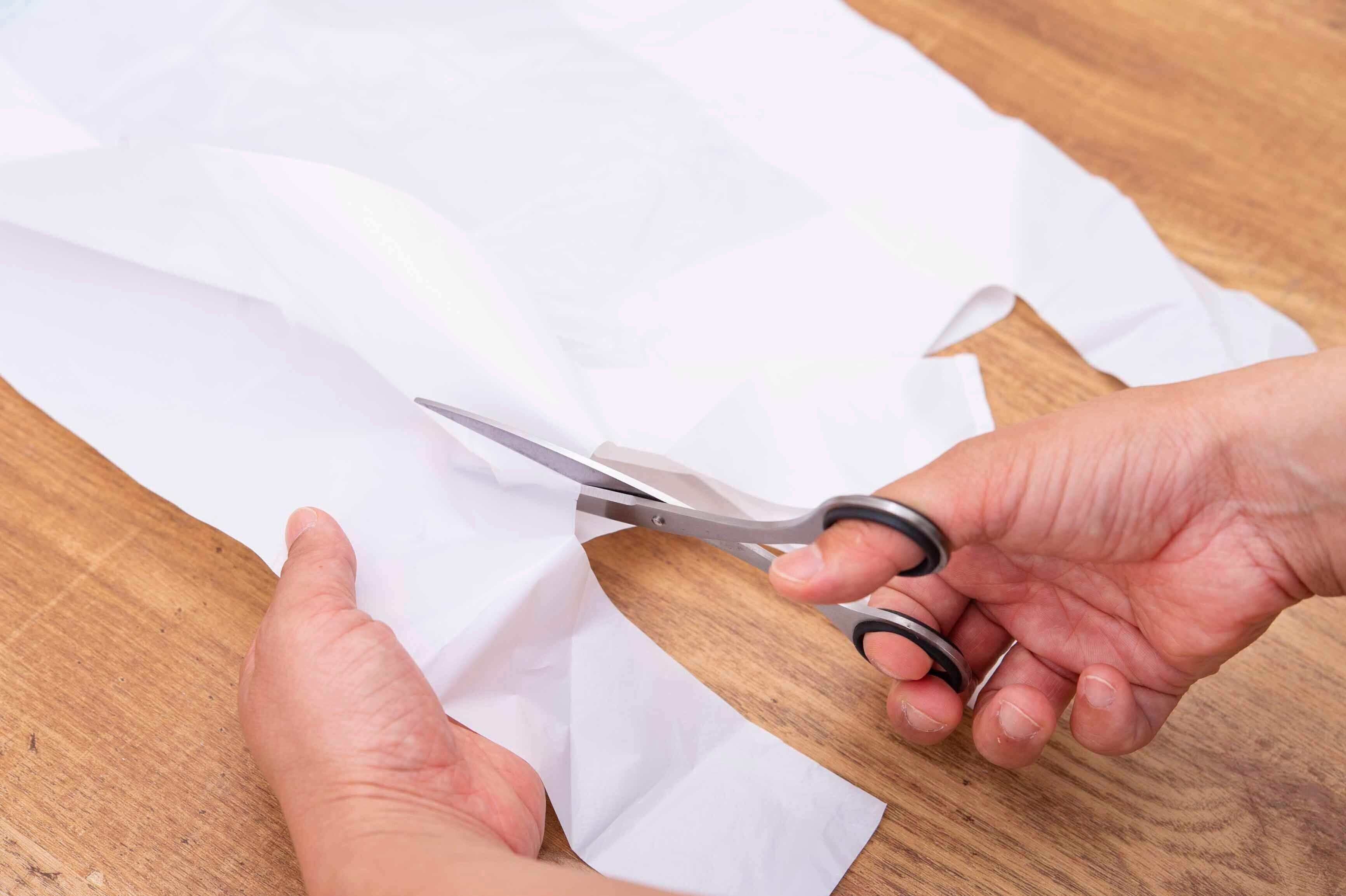 レジ袋の持ち手部分の端と、わきの部分をはさみで切り、1枚のビニールシート状になるよう広げます。