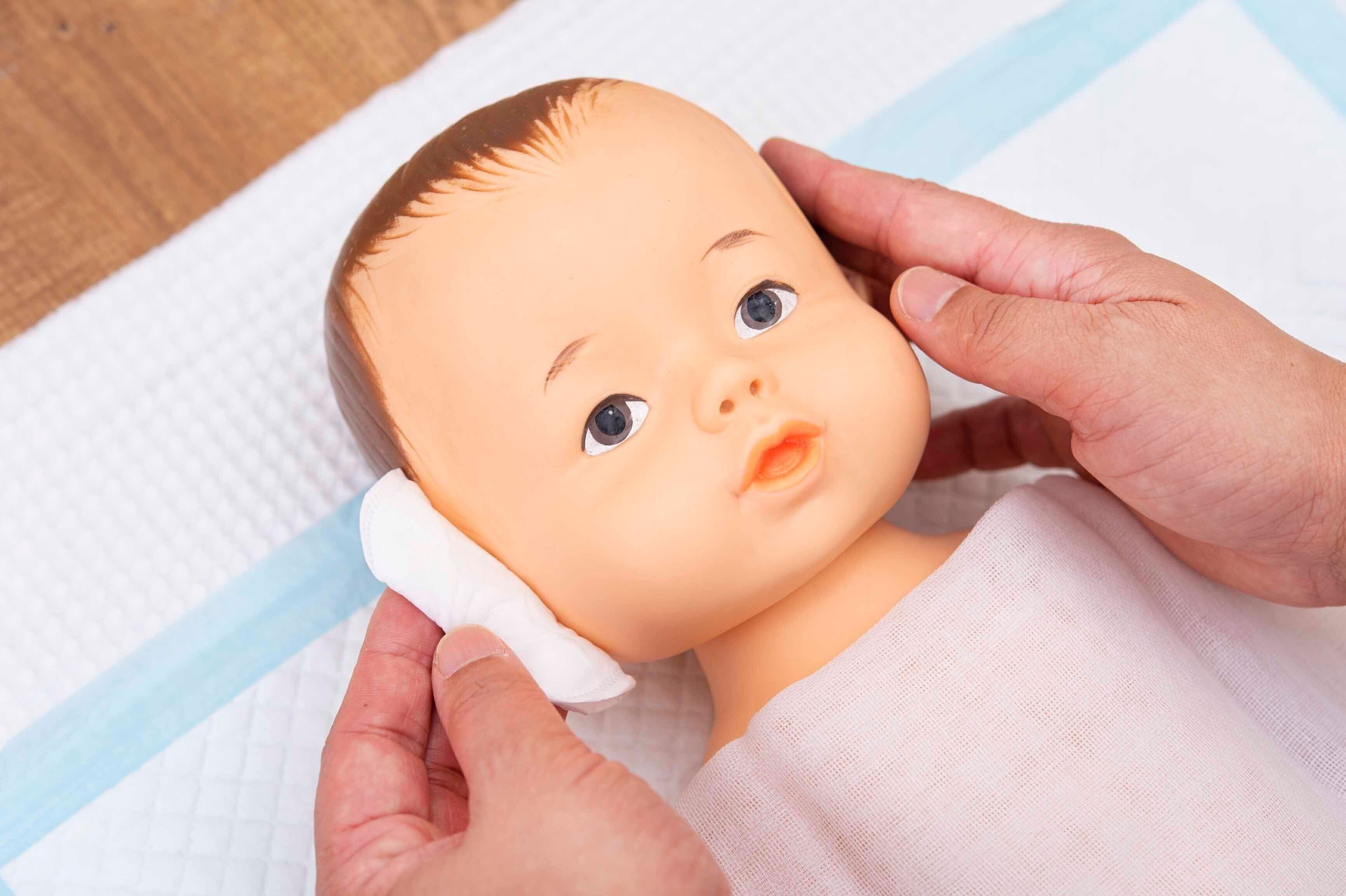 キリや金ぐしなどで、ペットボトルのキャップに穴を開けておきます。そこに水(用意できれば湯)を入れ、カット綿をぬらしましょう。そのカット綿で、顔や耳まわりをやさしくふきます。