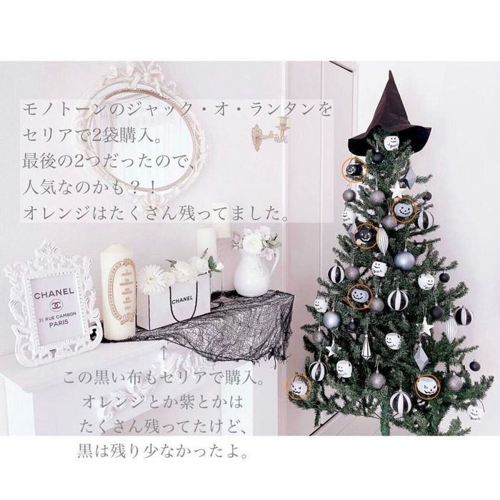 aska..さんはクリスマスツリーにジャック・オー・ランタンやおばけのオーナメントを飾ってハロウィン仕様に♪ ホワイトカラーのインテリアに合わせて、ツリーもモノトーンでまとめたそうですよ。オレンジの丸で囲われているジャック・オー・ランタンは、セリアで購入したみたいです。