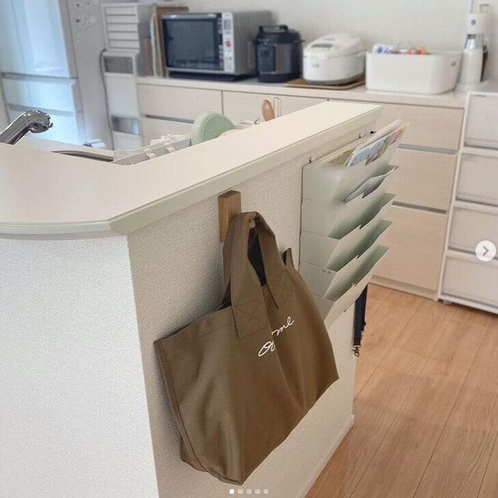 ___fukueri0410さんが設置したのは、壁に付けられるフックです。キッチン横にカバン掛けとして取り付けたんだそう。お気に入りのカバンが常に目に入るので気分が上がるんだとか♪ お出掛け時にサッと準備ができるのがいいですね!