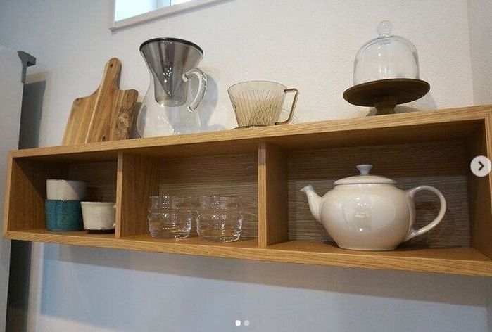 reiさんは、キッチンに壁に付けられる家具を設置したそう。家具箱の中だけでなく、上段も有効活用してレイアウトしているんですね!オシャレなティーポットやカップなどを飾ることで、とても素敵な見せる収納になっています♪