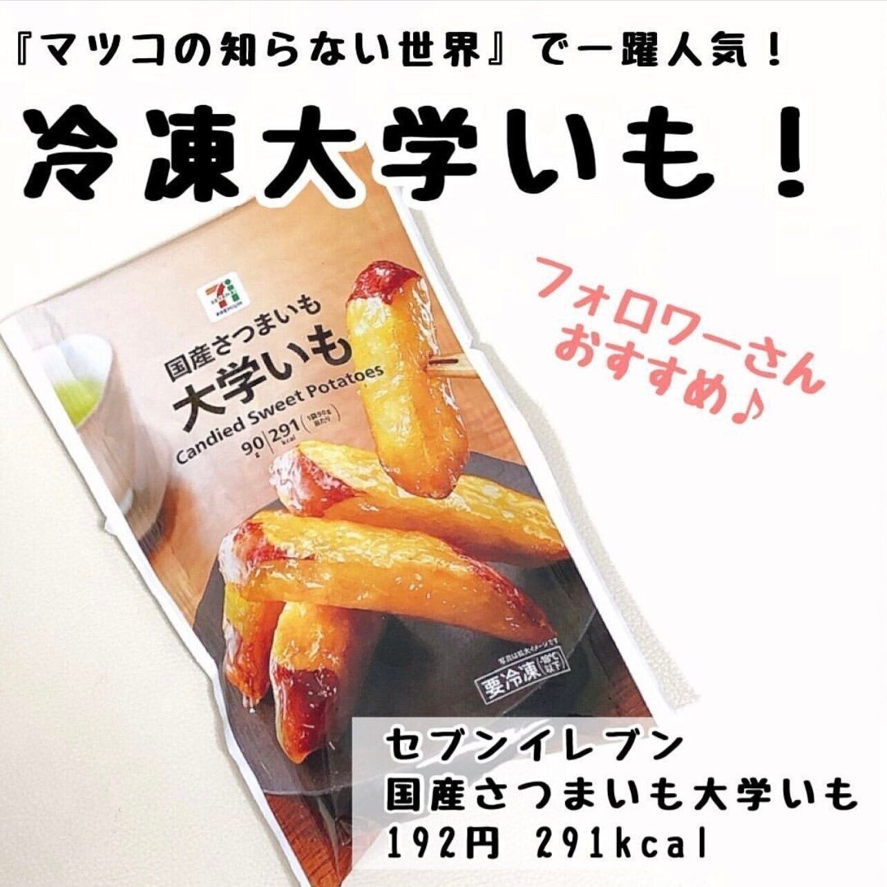 モンチママさんはセブンイレブンの大学いもを購入。こちらは数年前にテレビ番組で紹介されて話題となった商品なんだそうですよ。水飴でコーティングされているので外はカリッと、中のお芋はホクホク♪ 30分の自然解凍で食べられるそうですが、あえて解凍を待たずにアイス感覚で食べても!こちらは192円だそうです。