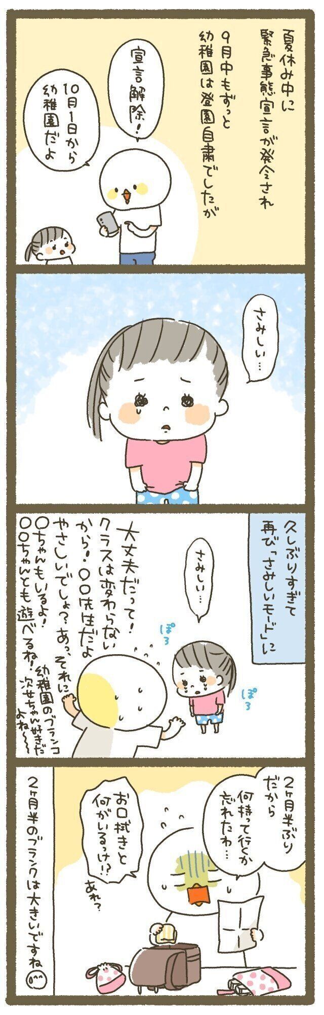 その後、土日をはさんで月曜日からまた幼稚園が始まりましたが、少しだけ「さみしい」とは渋るものの、泣いたり暴れたりもせず通えています。