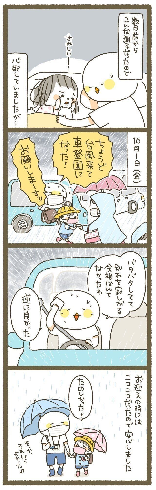 ところが9月末に発生した台風がちょうど登園初日の10月1日朝に接近し、登園時間は大雨に!