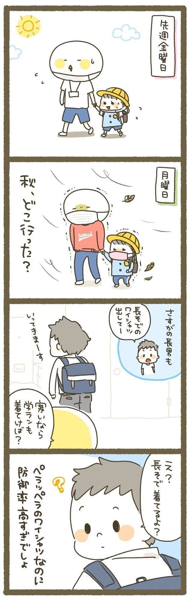春に着ていた服なのに、どれもツンツルテンでお腹も冷えちゃいそう。夏の間に、こんなに大きくなったのねぇ…。