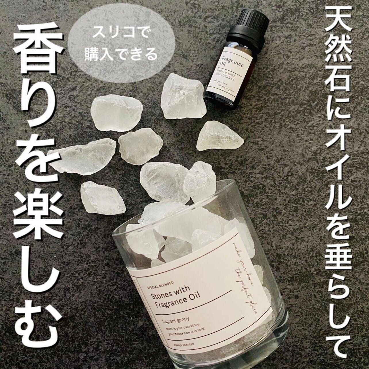 こちらは3COINSで発売された、ナチュラルストーンアロマ。ミントさんはホワイトカラーの天然石を選んだそうですが、他にピンクやブルーがあったそうですよ。アロマオイルボトルも付いて500円(税込550円)はお買い得とのこと。ホワイトのこちらは、甘い香りのアンバーのオイルがセットされていたそうです。