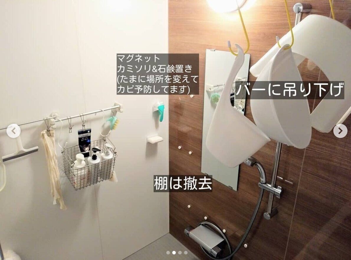 お風呂に常備する物を極力減らすことで掃除の手間を省いているmaiさん。シャンプーやリンス、カミソリやイスなどは浮かせて収納しているそうです。壁や床との接地面を少なくすれば湿気や水垢も溜まりにくいですよね!