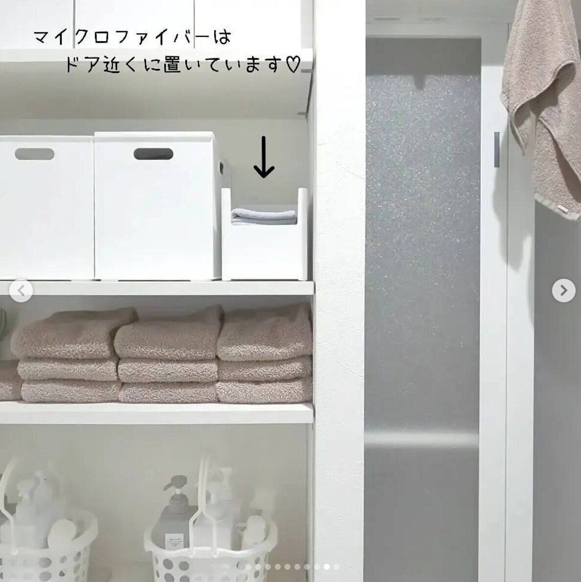 ayaさんはお風呂上がりに浴室リセットこそうじ(小掃除)を実践!マイクロファイバーをドア近くに常備し、水垢や曇りが気になる部分を簡単に拭くそうです。髪の毛を拭きながら片手で簡単に拭くだけでピカピカが保てるとか!