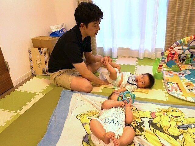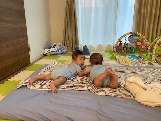 1人をお世話中、もう1人は近くでおもちゃで遊んでもらっています。双子で通じ合うものがあるのか、近くで待たせるといい子でいてくれることが多く助かります。