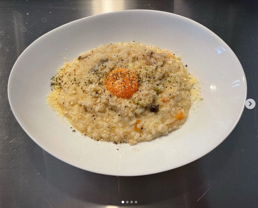 yanka_by_ayuさんはこちらのリゾット風おじやを。残ったもつ鍋のスープに冷やご飯、とろけるチーズ、塩、胡椒で味を整えて、器に盛った後は卵黄、パルメザンチーズ、黒胡椒をかけて出来上がり!オシャレなアレンジメニューですね。