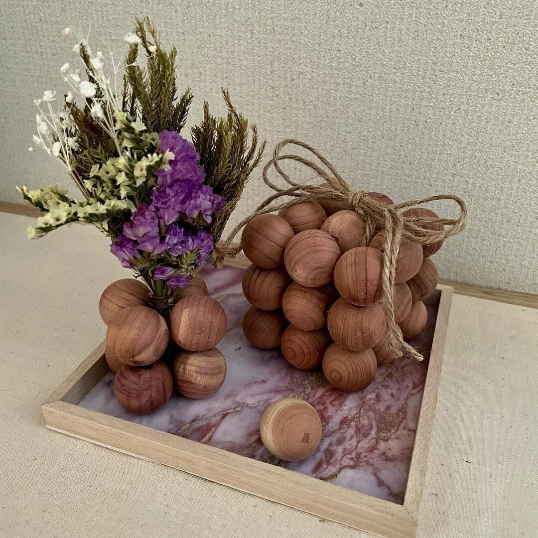 t_a_mj830さんは、シダーボールを組み立ててポンポンキャンドル風のインテリア雑貨を作成!組み立て方次第では、お月見団子のように作ることもできますね。シダーボールには消臭効果もあるため、玄関など臭いが気になる場所に使えるのだとか。