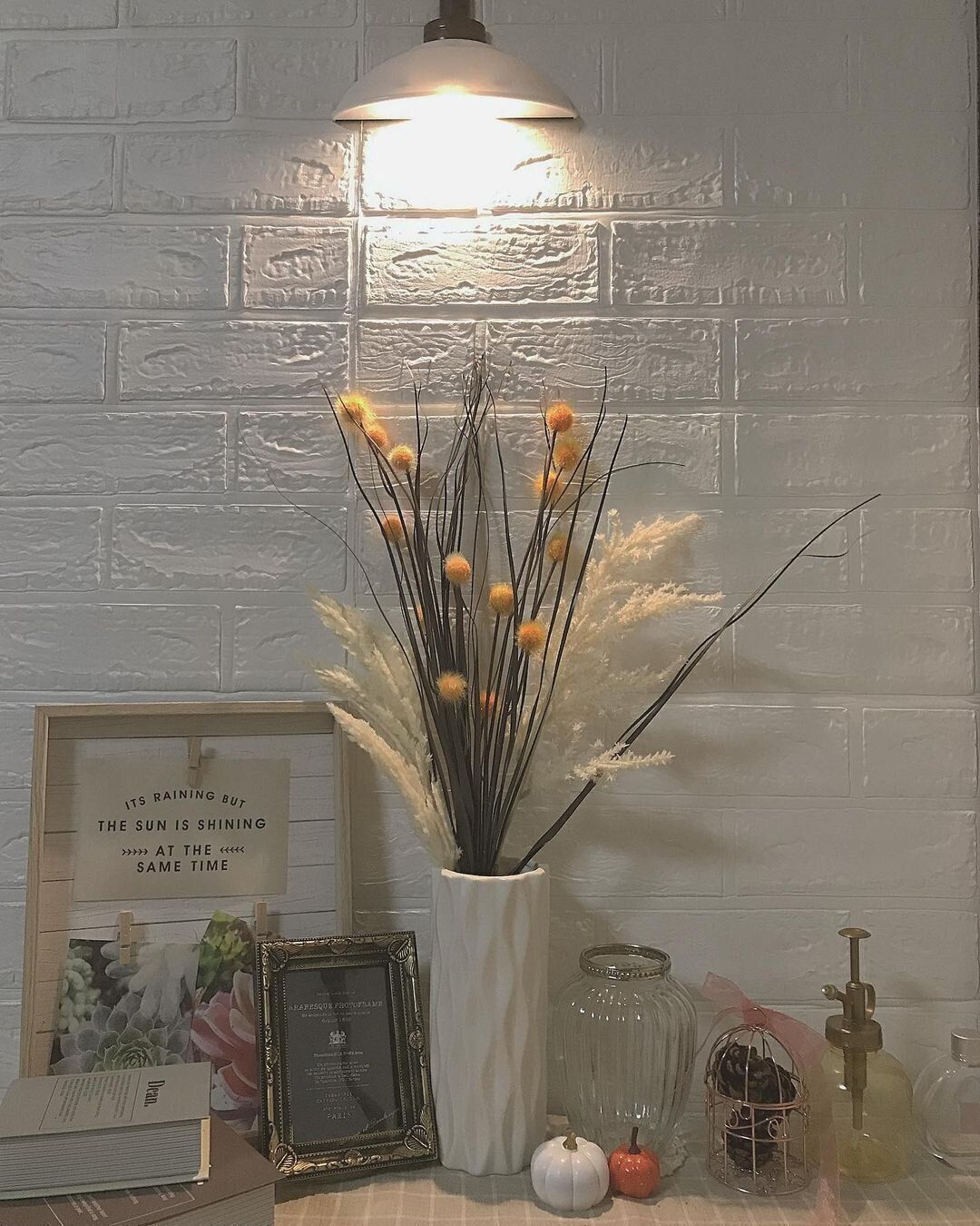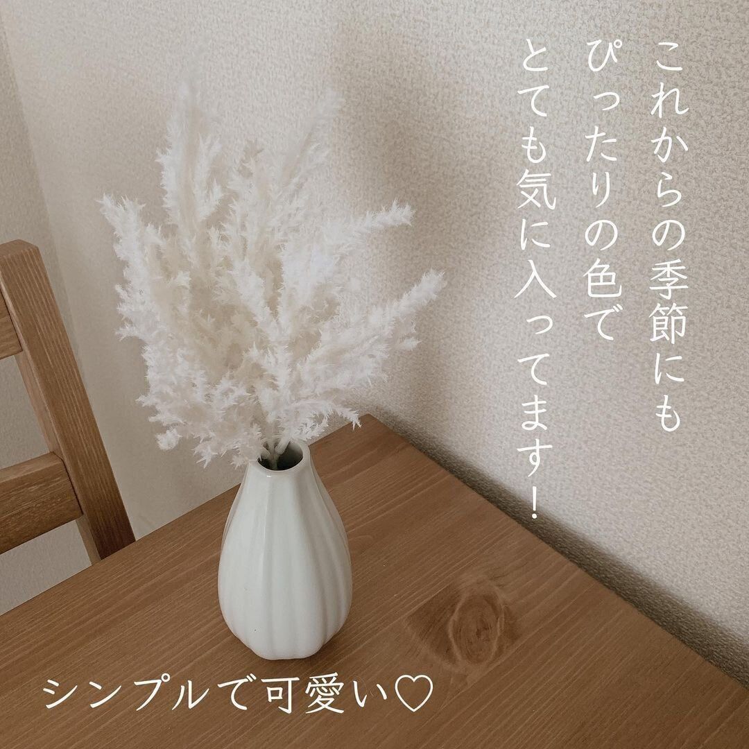 ちゃしさんは、ダイソーの造花「パンパスブッシュ」を購入!ふわふわした穂先が特徴のパンパスは、秋のインテリアにぴったりですね。見た目が白く、洗面所などに飾っても清潔感があっておしゃれなのだそう。