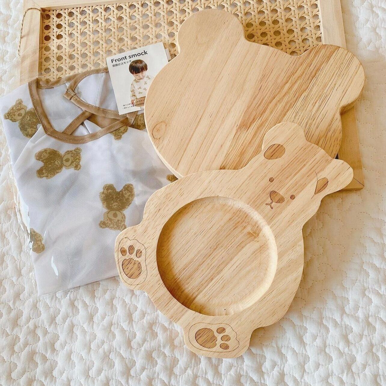 こちらは3COINSのくまウッドプレートにくまウッドボード、それに前掛けスモック。くまグッズ好きのKuma chanさんはたくさんのくまさんグッズがゲットできて離乳食づくりに張り合いが出たみたい。お子さんも可愛いくまさんグッズでごはんタイムがさらに楽しくなりそうですね。