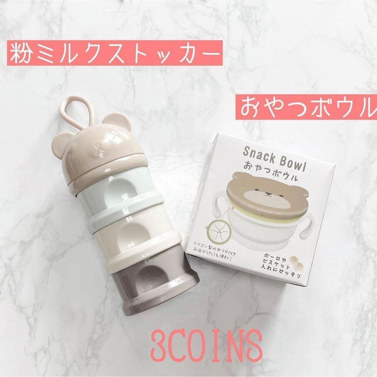 YUIさんが3COINSで一目惚れしたのは、くまさんモチーフの粉ミルクストッカー。1回分ずつを分けて3回分の粉ミルクを持ち運ぶのに便利みたい。おやつボウルはお子さんがもう少し大きくなってから使いたいと、こちらも可愛さに惹かれて購入したとのこと。