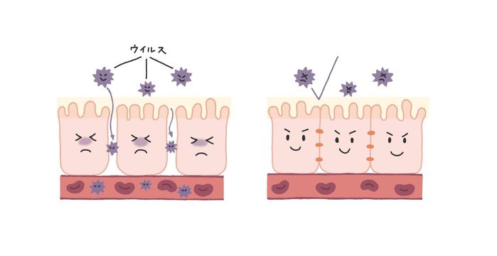 また最近の研究では、ビタミンDは、ウイルスから体を守る効果があるとわかっています。ウイルスは、粘膜にある細胞の表面からレセプターという穴のようなものに結合し、細胞内に侵入します。このほかに、細胞同士のすき間から侵入するルートもあります。通常、ビタミンDや亜鉛、ビタミンCなどの栄養素が、この細胞同士をくっつけてウイルスを侵入させない役割をしていますが、これらの栄養素が欠乏すると細胞間のすき間がゆるみ、そこからウイルスが入り込んでしまうのです」(時田先生)