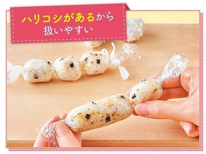 離乳後期になると、赤ちゃんに「自分で食べたい」意欲が育ち、手づかみ食べが盛んになります。サランラップ®はハリコシがあって丈夫。赤ちゃん用の小さなおにぎりを作るときも茶巾形、ボール状など、いろいろな形状にしっかりにぎることができます。赤ちゃんの目の前でサランラップ®でおにぎりをにぎってあげると、興味を持って自分で食べたがります。