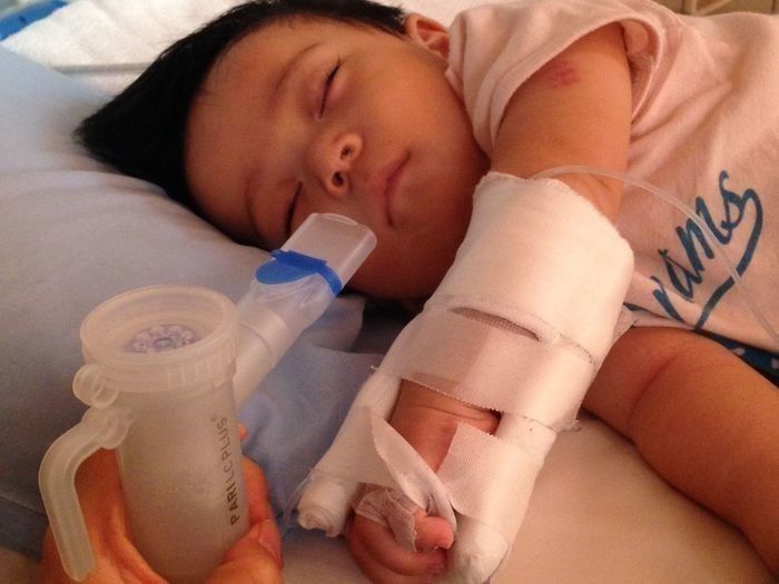 実は筆者の子どもも、7カ月だった一昨年の9月に、RSウイルスによる入院を経験しました。画像は入院先の病室で撮影したもので、呼吸をラクにするための吸入処置を受けているところ。症状悪化による入院は、決して人ごとではありませんでした。ほぼすべての子どもが感染するといわれるRSウイルス。感染を防ぐことは難しいですが、まずはママ・パパが正しい知識を持つことが大切です。「まだ暑い時期だし…」と思わずに、風邪のような症状があった場合にはRSウイルスを疑って、早めの受診を心がけましょう。(取材・文/ひよこクラブ編集部)