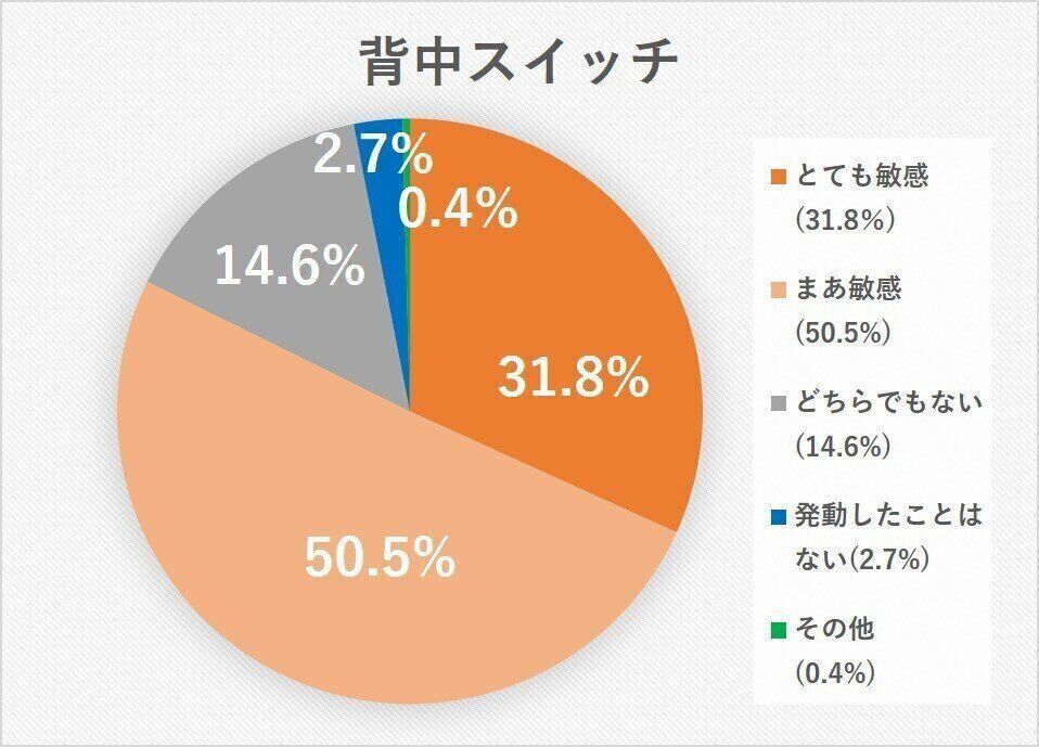 2021年2月〜8月に生後2カ月前後の赤ちゃんのママに実施したアンケート結果(有効回答数7,444)によると、「とても敏感」は約32%、「まぁ敏感」を合わせると約82%とという高い数値結果に。多くの赤ちゃんが背中スイッチを搭載しているようです。そして、背中スイッチと格闘しているママから、寝かしつけテクニックのコメントが96件も寄せられました。