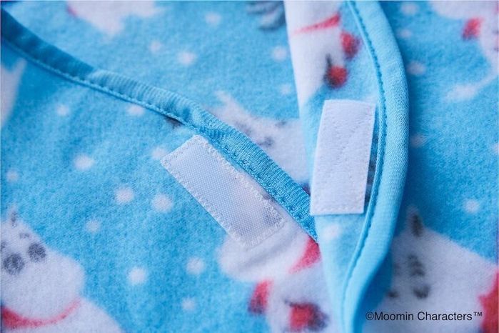 フリーススリーパーの前面には、普通の面ファスナーよりも柔らかいベビー用の面ファスナーを使用。おむつ替えやお着替えのときにはパッと脱がすことができるので、寒くなって重ね着をするようになっても、これならラクチンです。