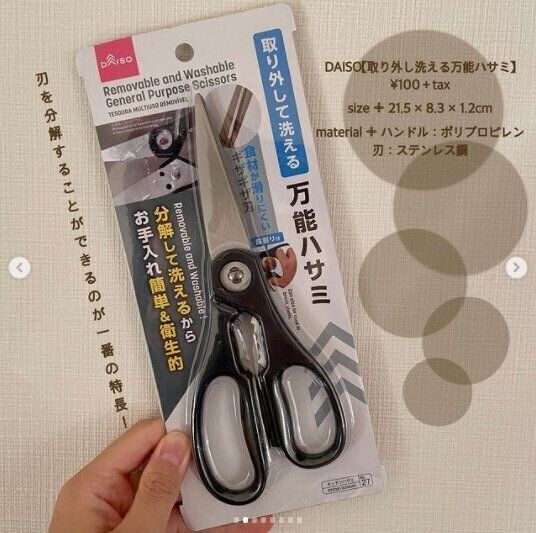 意外と使う頻度が高いキッチンバサミ。ハサミの部分に汚れが溜まってしまい、きれいにするのが大変ということはありませんか?ダイソーの「取り外して洗える万能ハサミ」はその名の通り、ハサミを分解することができるのだとか。お手入れも簡単で衛生的ですね!