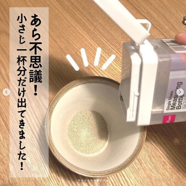 お味噌汁やスープなどに使う顆粒だし、毎回計量スプーンで測るのは面倒ですよね。ダイソーの「ひとふり計量ボトル」は、1回振るだけで小さじ1杯分が出てくるのだとか。毎日のお料理の時短になりそうですね。