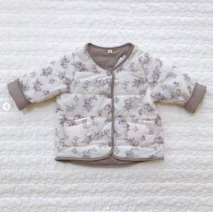 misakiさんはこちらのアウターを購入。柔らかい色合いでとってもキュート!スナップボタンなので、プチプチプチッと一瞬で脱ぎ着ができちゃいますね。見た目も軽そうで、公園やお出かけなどのアクティブシーンにもピッタリですね。
