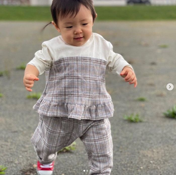 一椛mamaさんは「チェックジャカードコンビT」と「ウエストリボンテーパードパンツ」をセットで購入。胸元から切り替えでチェック柄になっており、とってもキュートなデザイン!元気いっぱい走り回れそうなゆったり感も魅力ですね。